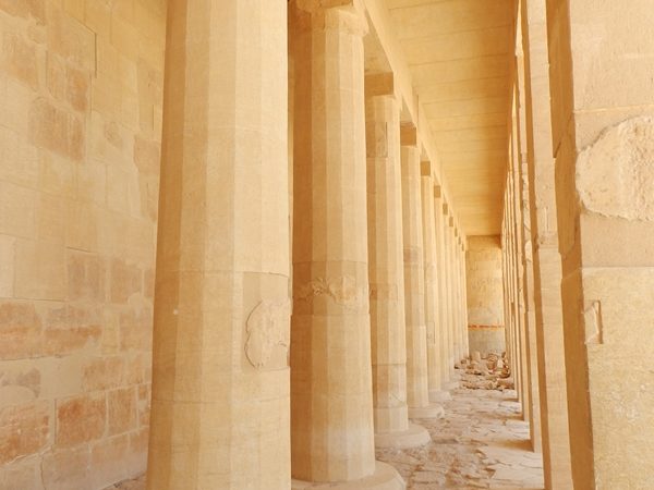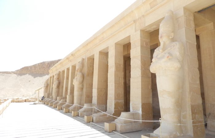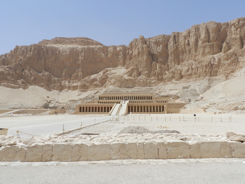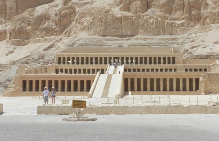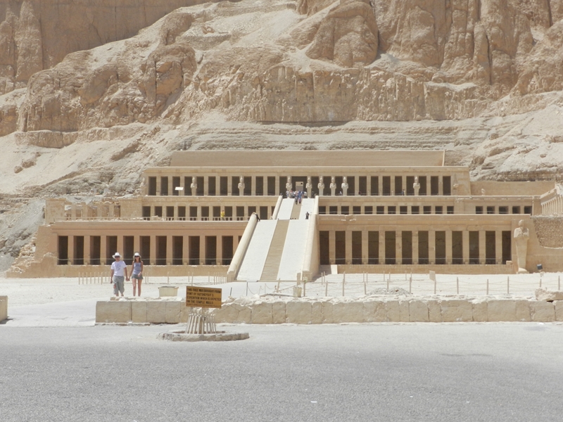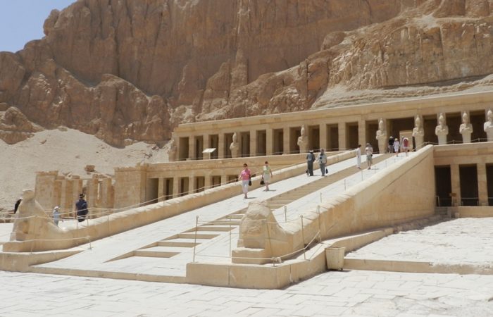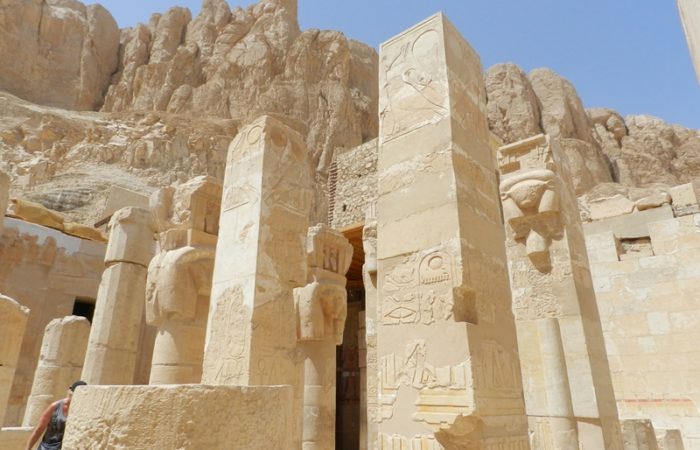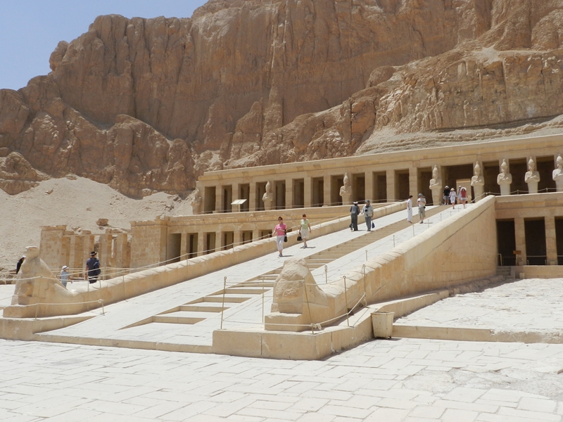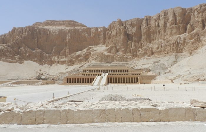 Der Totentempel der Hatschepsut stammt aus der 18. Dynastie und ist der am besten erhaltene Tempel in Deir el-Bahari am Westufer des Nil in Theben. Auffällig ist seine eigenwillige Architektur.[1] Die Pylone sind durch offene Pfeilerhallen am Anfang je einer Terrasse ersetzt. Der gesamte Tempel ist aus Kalkstein errichtet.